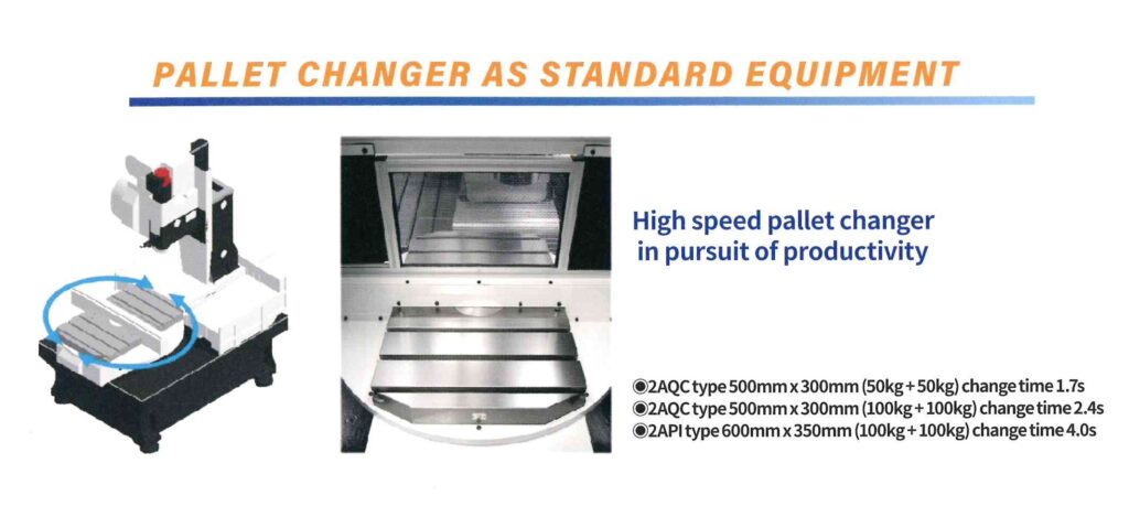 High speed and high accuracy pallet changer utilizes a curvic coupling location for unperilled accuracy and is supplied in two specifications, 2AQC at 1.7 second changes and the 2APIĀ at 4 second changes.